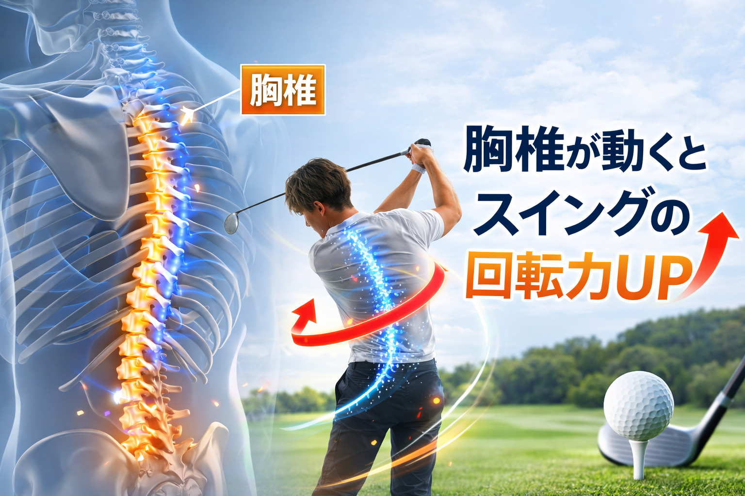 ゴルフスイングでは、この胸椎が回旋することで体がスムーズに回転します。