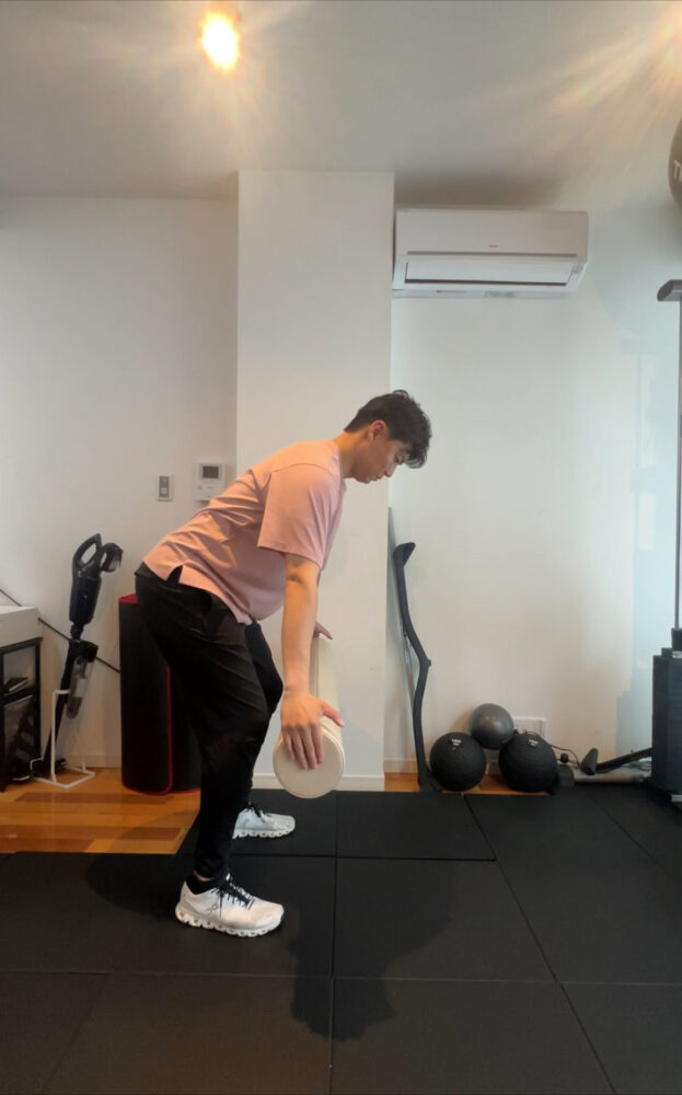 フォームローラーを両手で持ち、上体を前に傾けて背筋を伸ばします。