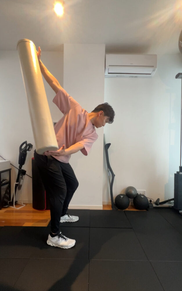 同じくフォームローラーを持ち、今度は上体を左右にゆっくり回旋させます。