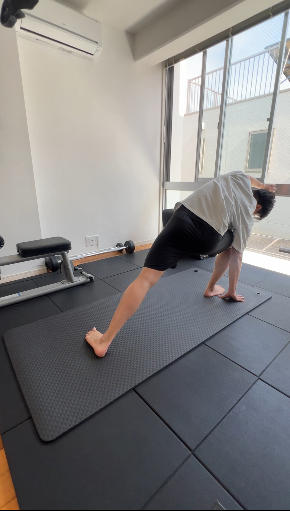 1. 片膝を立て、もう一方の脚を後ろに伸ばします(ランジ姿勢)