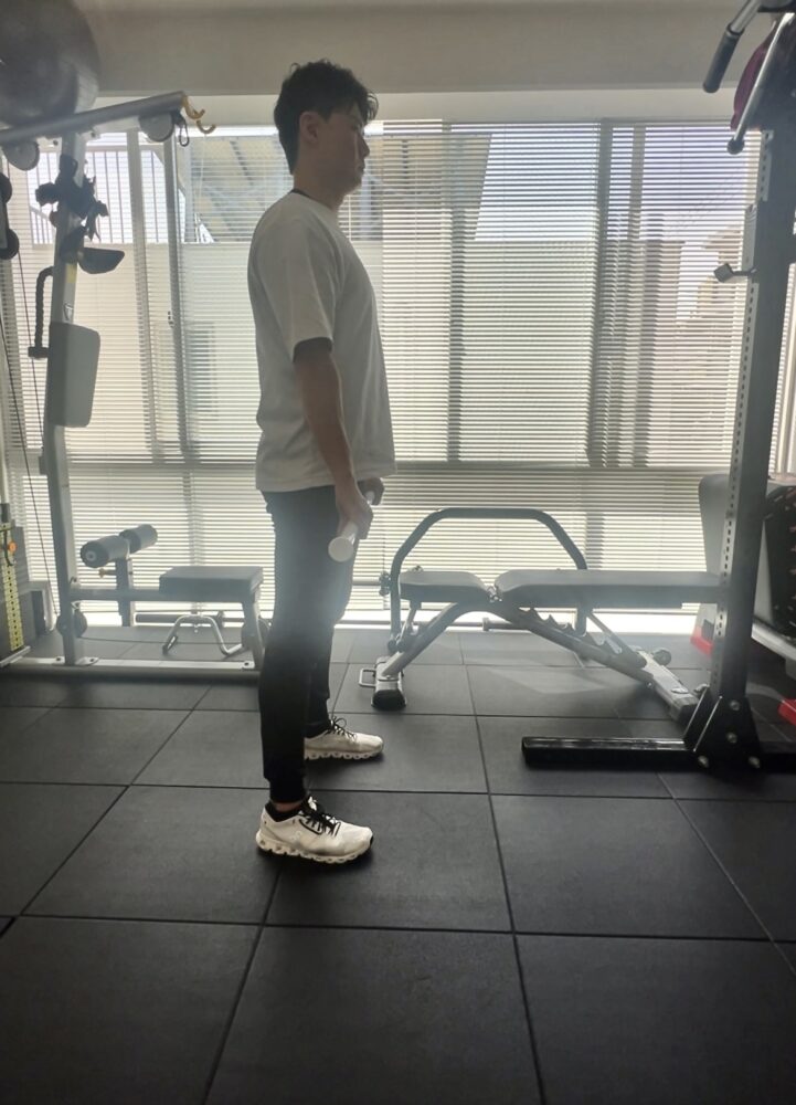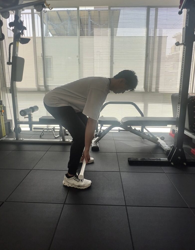 2. 腰を落としながら重りを握り、背筋は常に真っ直ぐに保ちます。